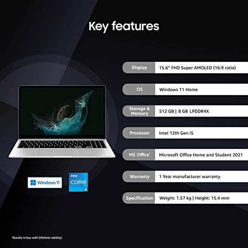 Operating System: Windows 11 Home | Preinstalled Software: MS Office Home & Student 2021, Live Message, Live Wallpaper, McAfee Live Safe (Trial), Screen Recorder, Samsung Gallery, Samsung Flow, Samsung Notes, Samsung Recovery, Samsung Settings, Studio Plus, Samsung Update, Samsung Security, Quick Share, Galaxy Book Smart Switch